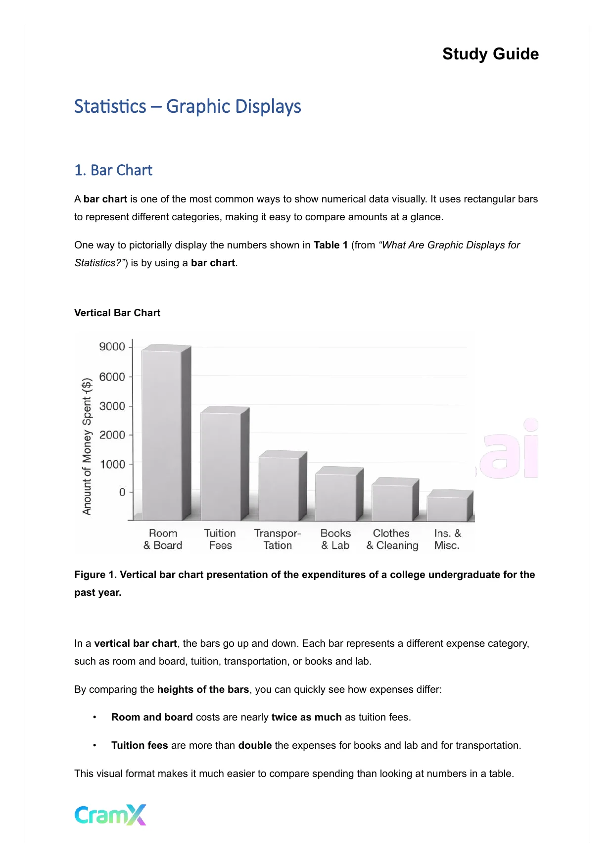 This document provides study materials related to Statistics - Graphic Displays. It may include explanations, summarized notes, examples, or practice questions designed to help students understand key concepts and review important topics covered in their coursework.