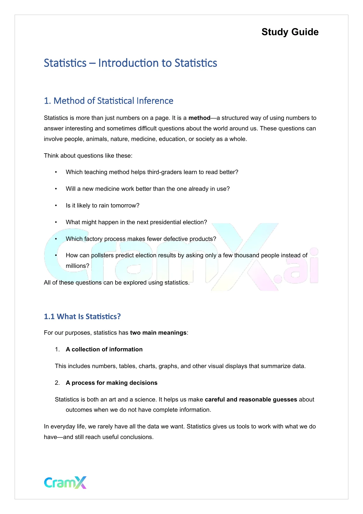 Students studying Statistics or related courses can use this material as a reference when preparing for assignments, exams, or classroom discussions. Resources on CramX may include study notes, exam guides, solutions, lecture summaries, and other academic learning materials.