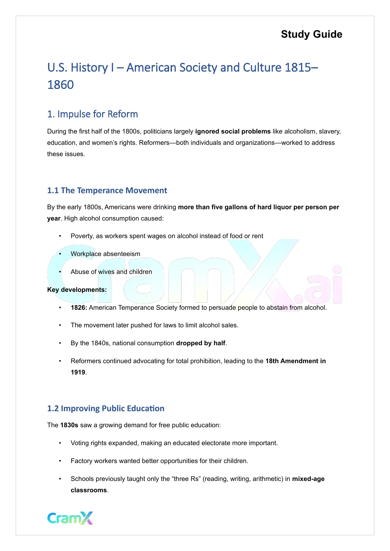 This document provides study materials related to U.S. History I - American Society and Culture 1815–1860. It may include explanations, summarized notes, examples, or practice questions designed to help students understand key concepts and review important topics covered in their coursework.