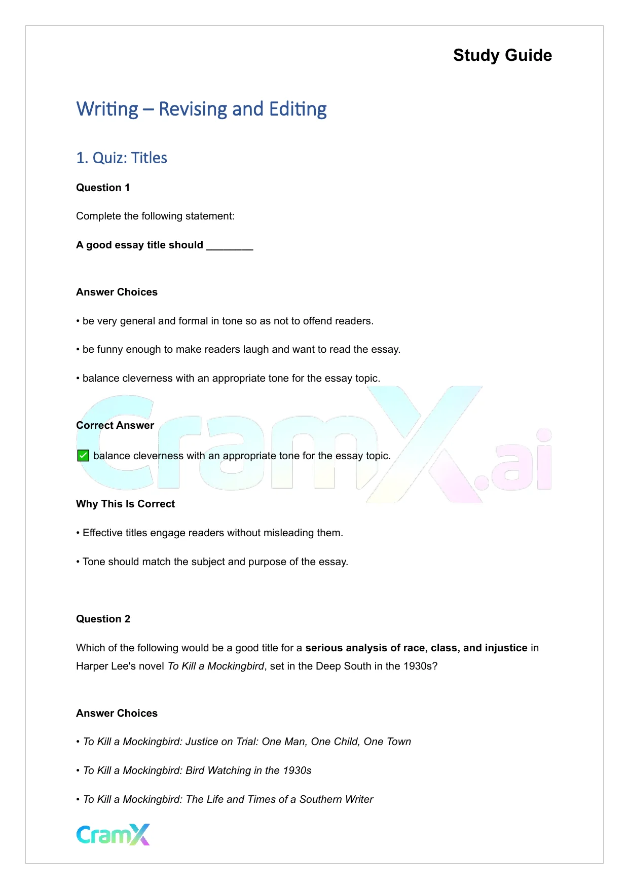 This document provides study materials related to Writing - Revising and Editing. It may include explanations, summarized notes, examples, or practice questions designed to help students understand key concepts and review important topics covered in their coursework.