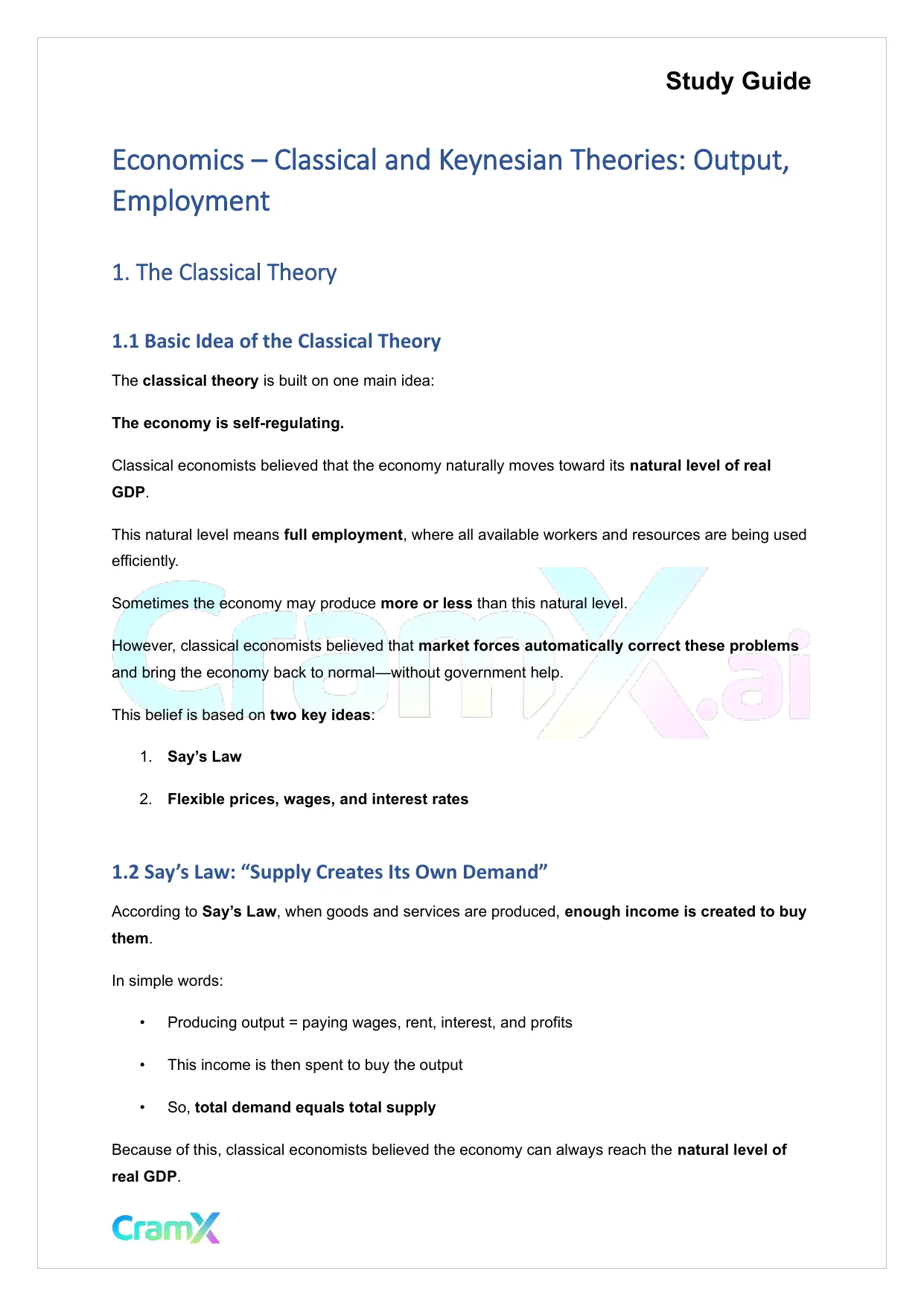 This document provides study materials related to Economics - Classical and Keynesian Theories Output, Employment. It may include explanations, summarized notes, examples, or practice questions designed to help students understand key concepts and review important topics covered in their coursework.
