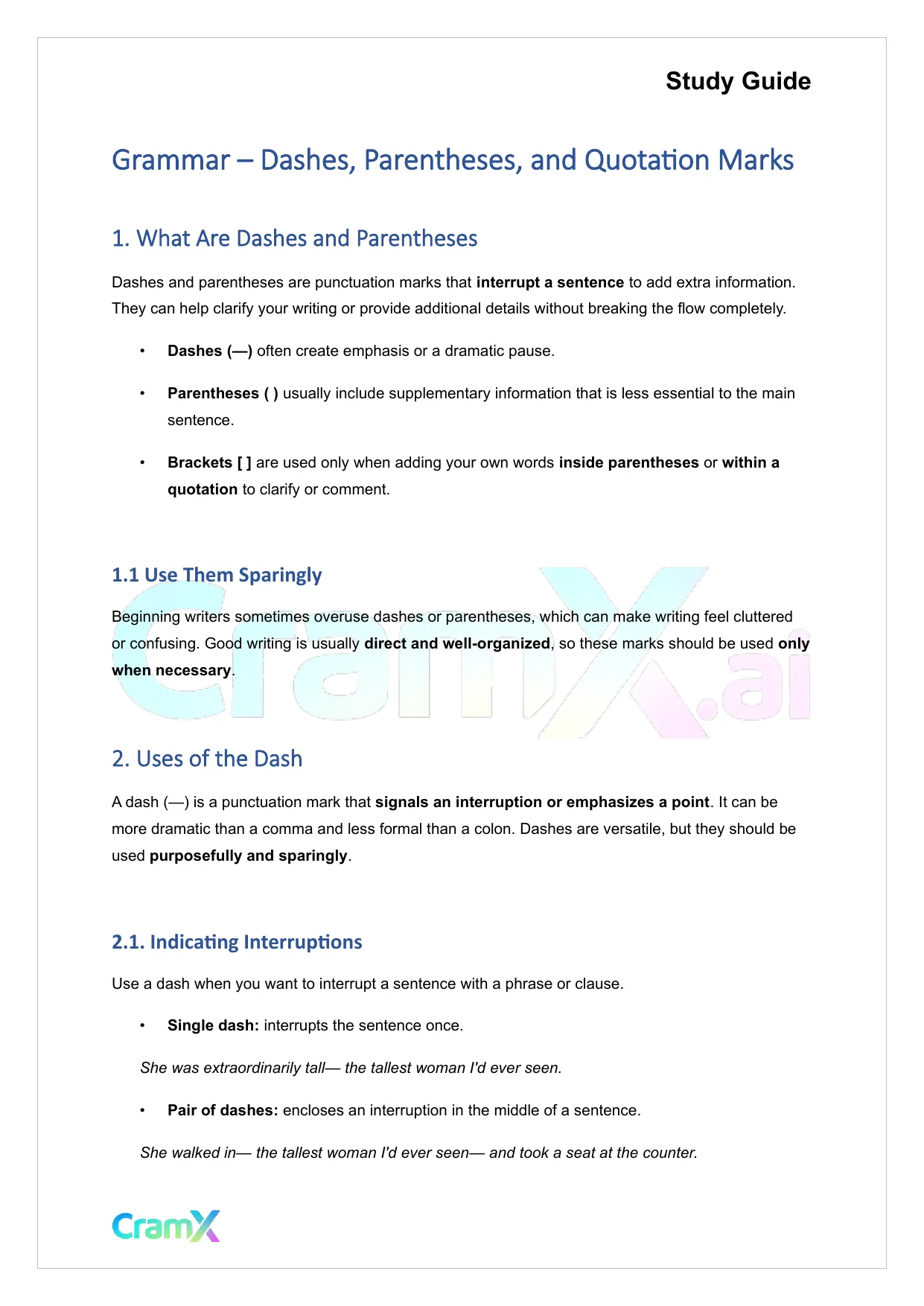 This document provides study materials related to Grammar - Dashes, Parentheses, and Quotation Marks. It may include explanations, summarized notes, examples, or practice questions designed to help students understand key concepts and review important topics covered in their coursework.