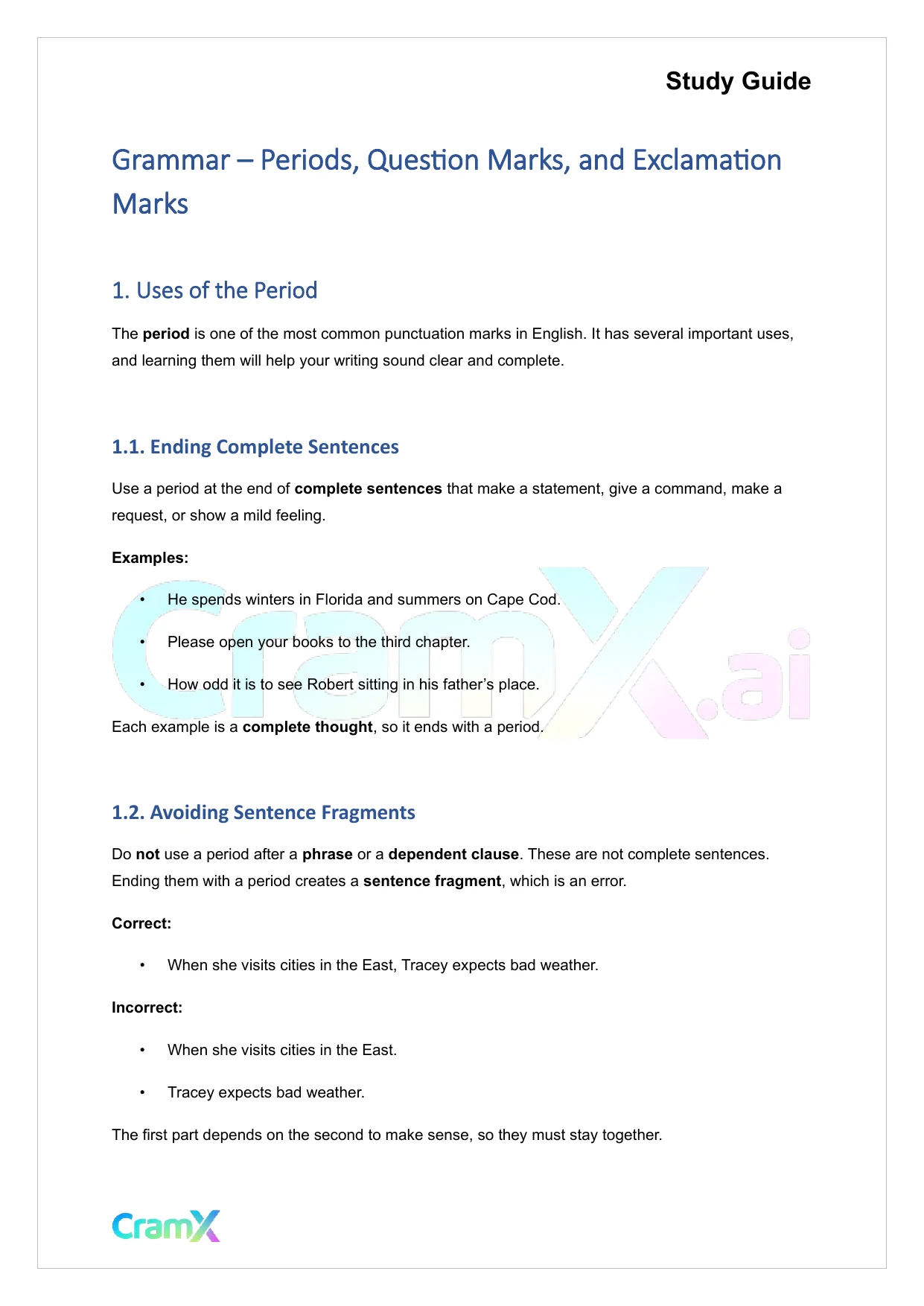 This document provides study materials related to Grammar - Periods, Question Marks, and Exclamation Marks. It may include explanations, summarized notes, examples, or practice questions designed to help students understand key concepts and review important topics covered in their coursework.
