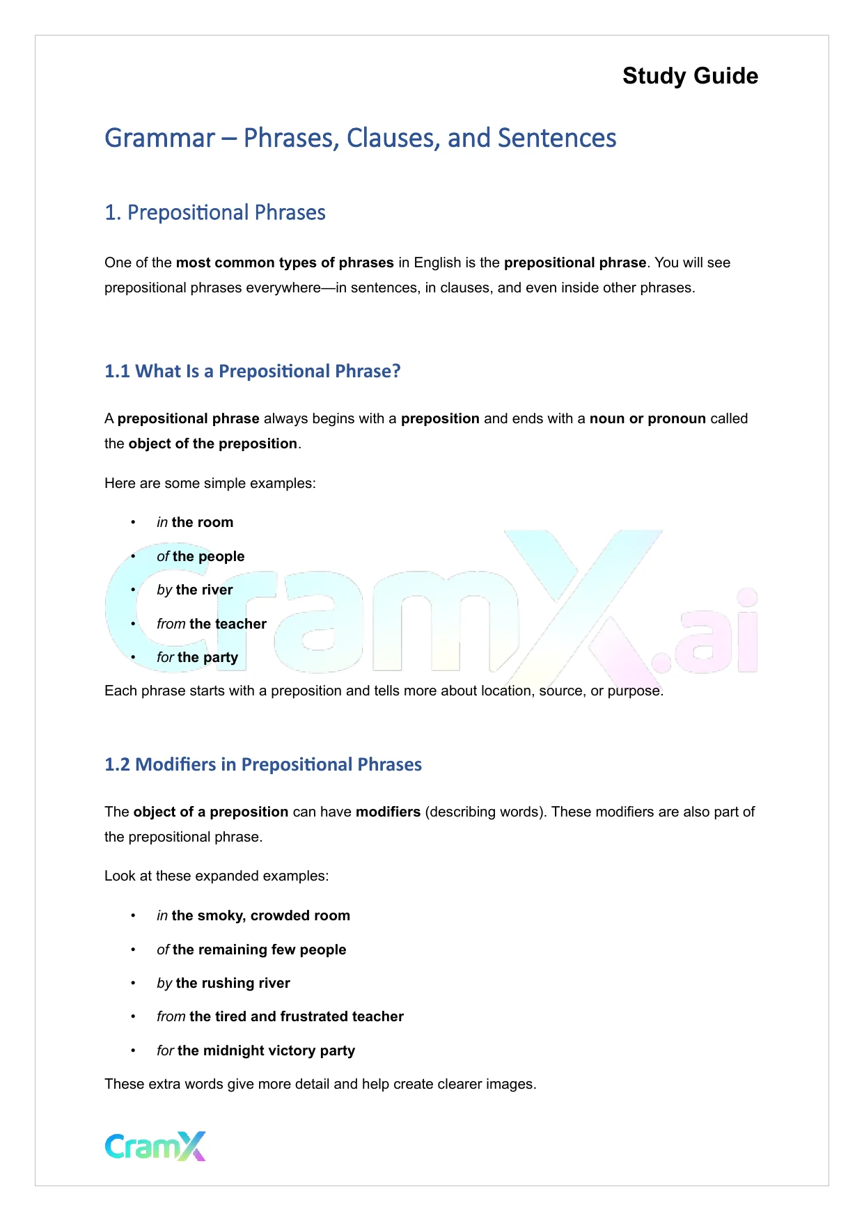 This document provides study materials related to Grammar - Phrases, Clauses, and Sentences. It may include explanations, summarized notes, examples, or practice questions designed to help students understand key concepts and review important topics covered in their coursework.