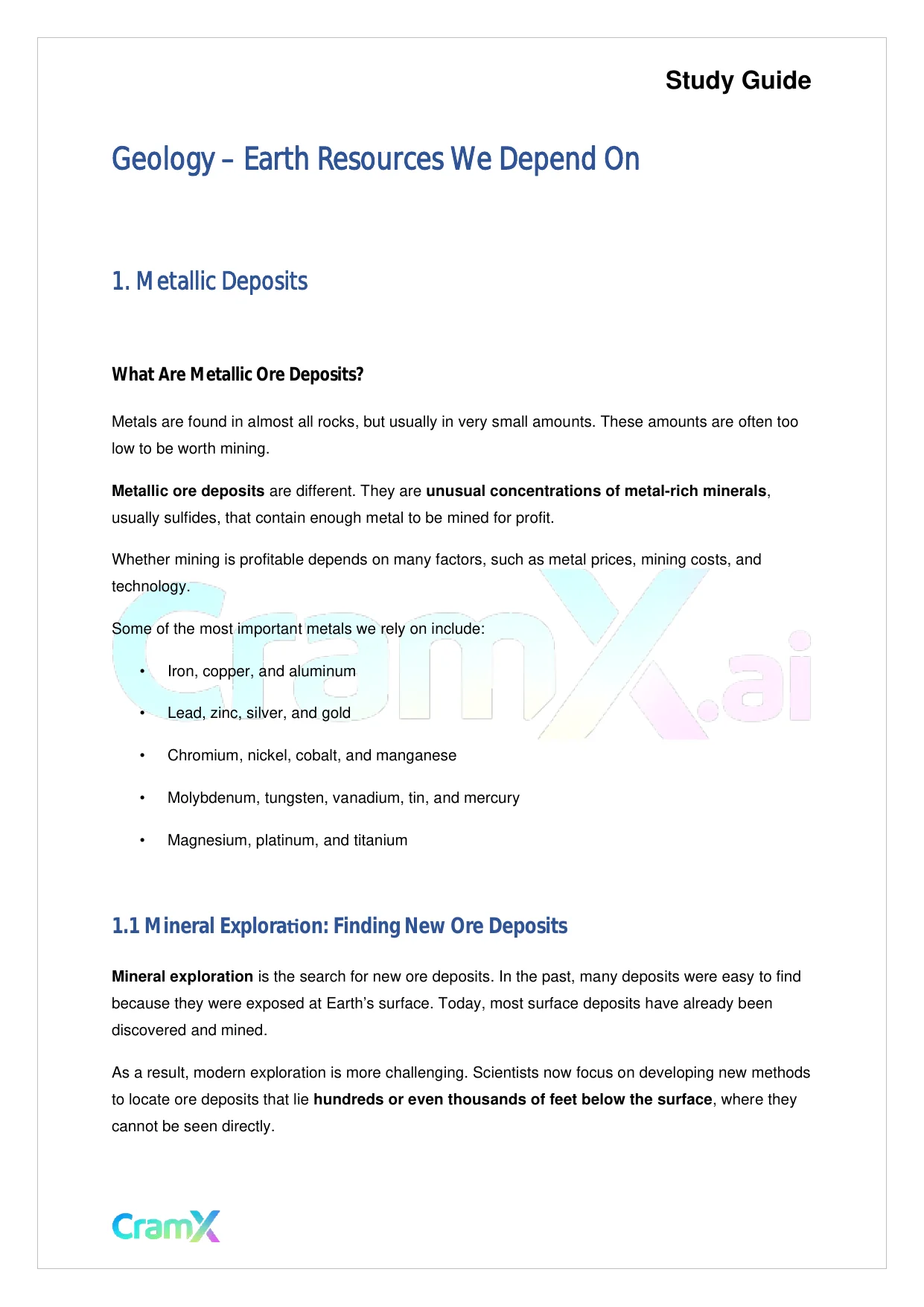 This document provides study materials related to Geology - Earth Resources We Depend On. It may include explanations, summarized notes, examples, or practice questions designed to help students understand key concepts and review important topics covered in their coursework.