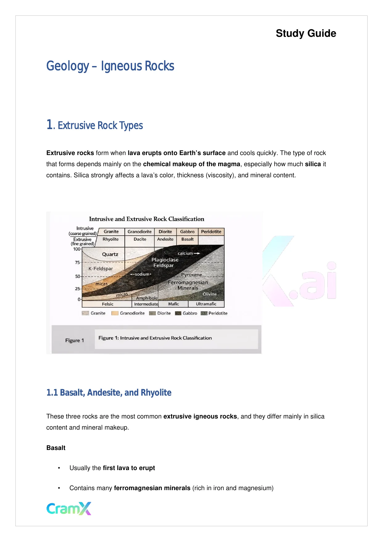This document provides study materials related to Geology - Igneous Rocks. It may include explanations, summarized notes, examples, or practice questions designed to help students understand key concepts and review important topics covered in their coursework.