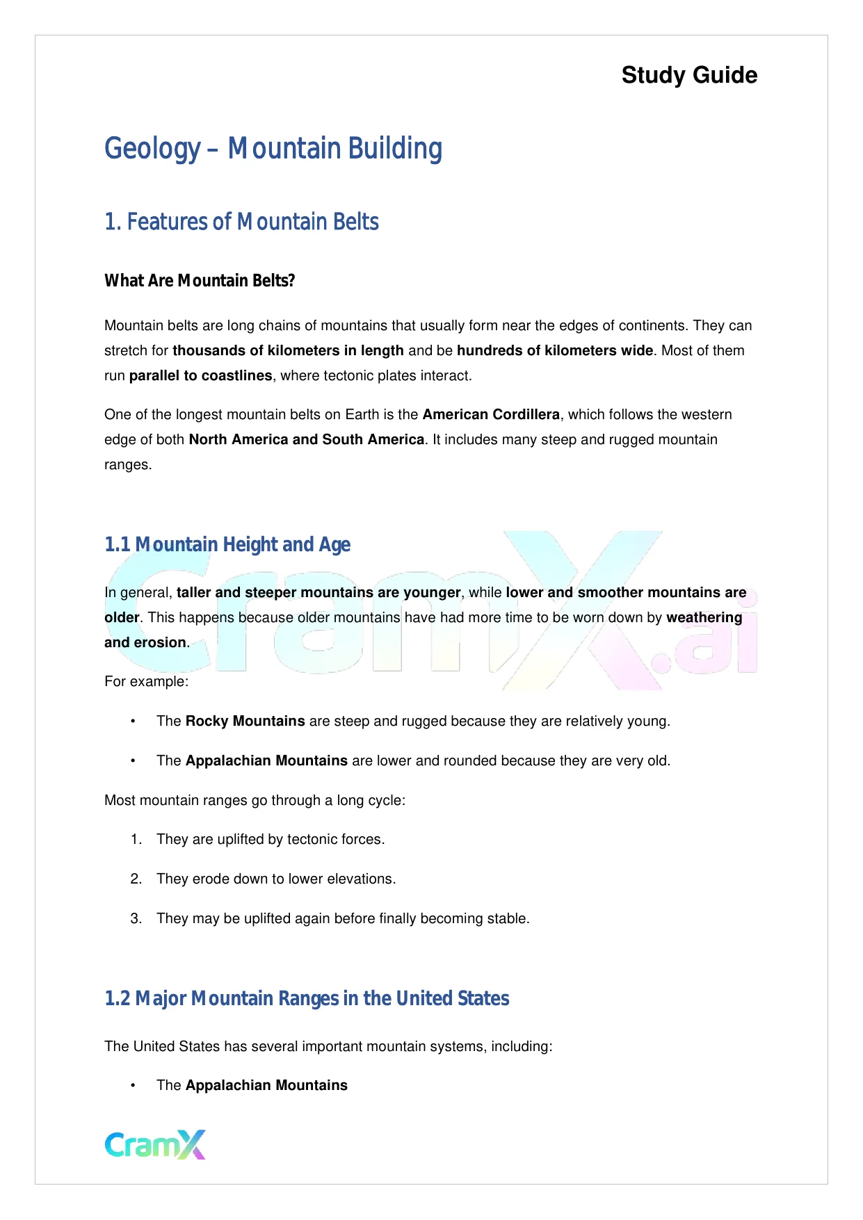 This document provides study materials related to Geology - Mountain Building. It may include explanations, summarized notes, examples, or practice questions designed to help students understand key concepts and review important topics covered in their coursework.