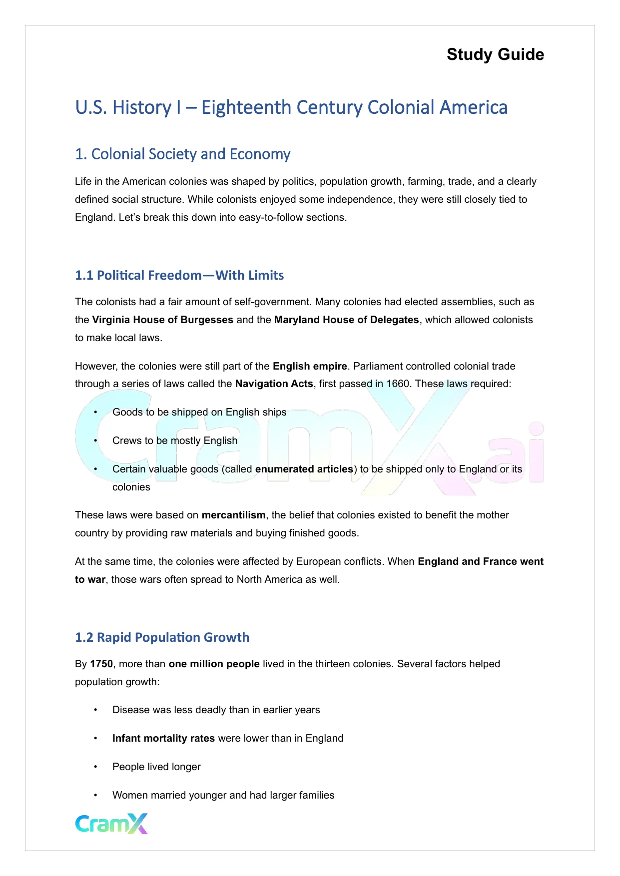 This document provides study materials related to U.S. History I - Eighteenth Century Colonial America. It may include explanations, summarized notes, examples, or practice questions designed to help students understand key concepts and review important topics covered in their coursework.