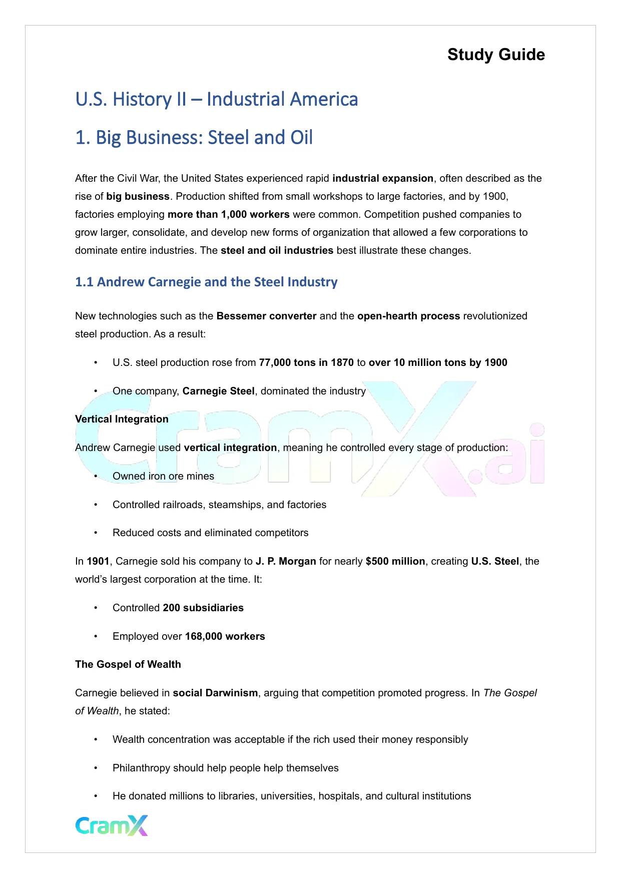 This document provides study materials related to U.S. History II - Industrial America. It may include explanations, summarized notes, examples, or practice questions designed to help students understand key concepts and review important topics covered in their coursework.