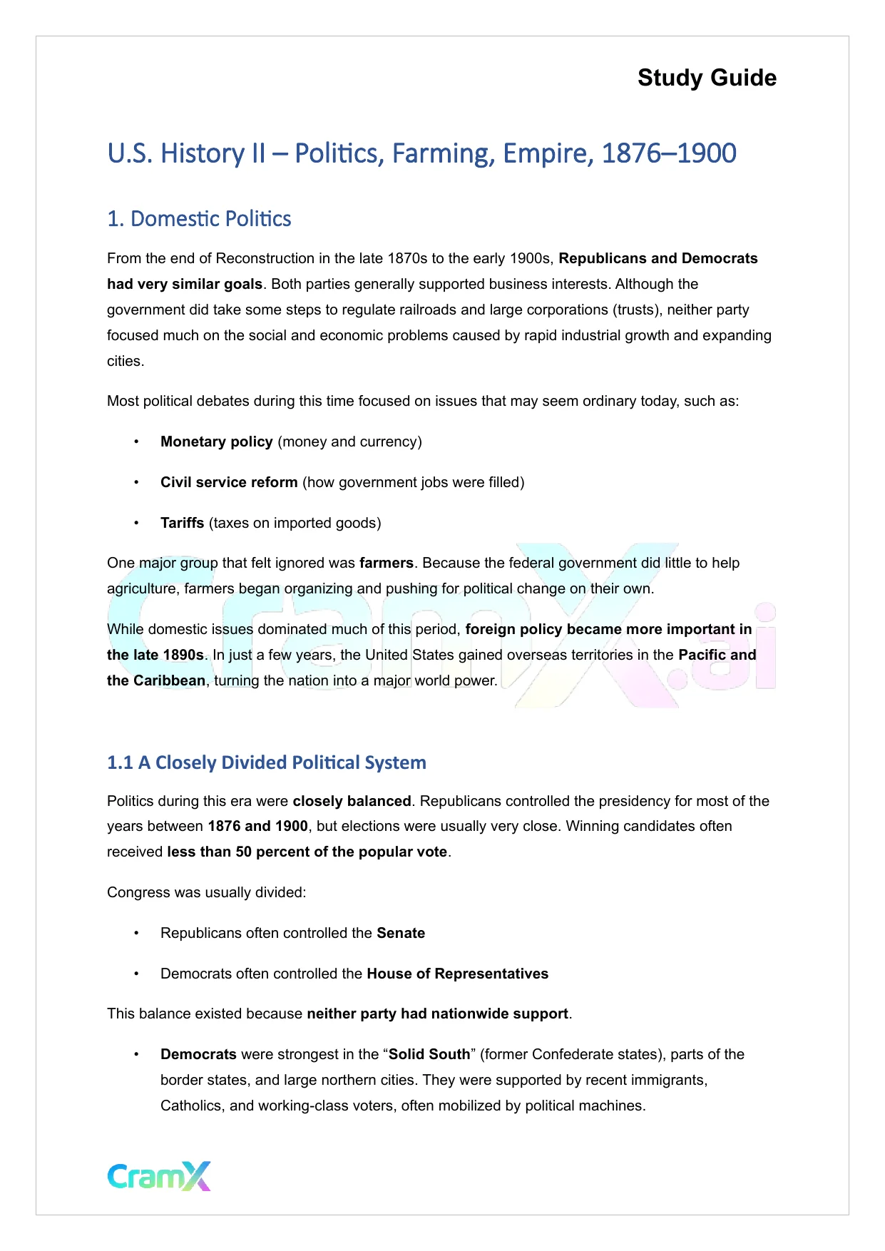 This document provides study materials related to U.S. History II - Politics, Farming, Empire, 1876–1900. It may include explanations, summarized notes, examples, or practice questions designed to help students understand key concepts and review important topics covered in their coursework.