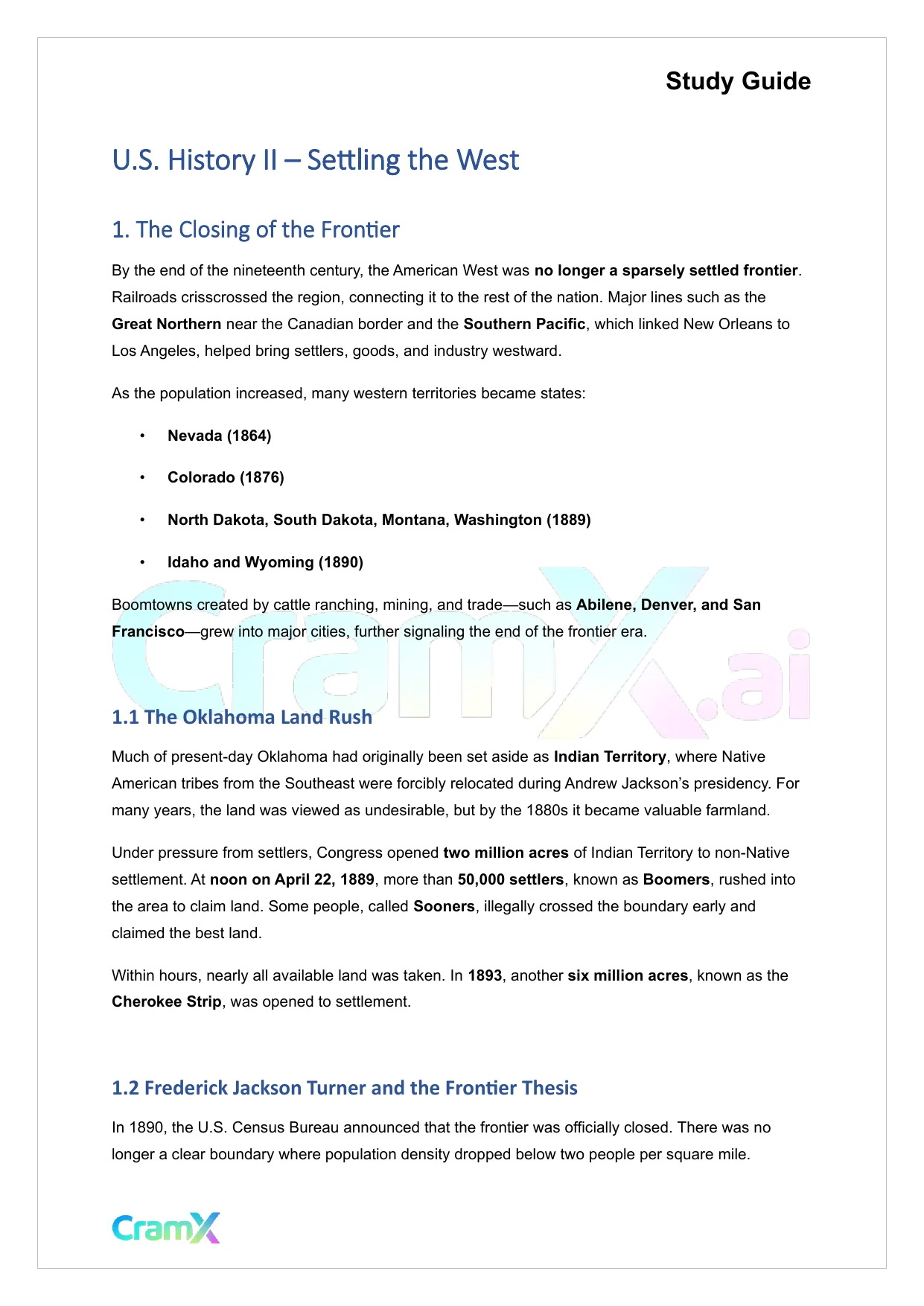 This document provides study materials related to U.S. History II - Settling the West. It may include explanations, summarized notes, examples, or practice questions designed to help students understand key concepts and review important topics covered in their coursework.