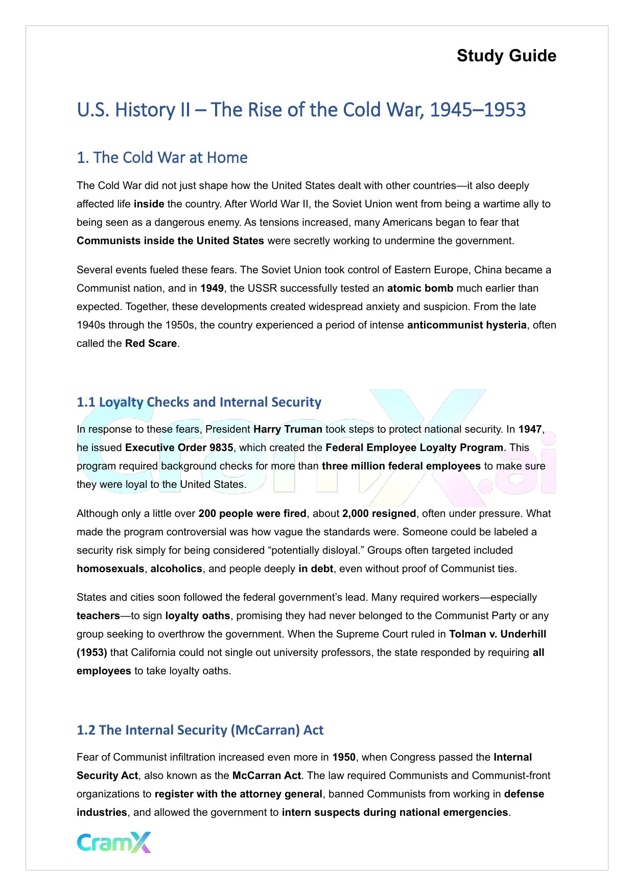 This document provides study materials related to U.S. History II - The Rise of the Cold War, 1945–1953. It may include explanations, summarized notes, examples, or practice questions designed to help students understand key concepts and review important topics covered in their coursework.