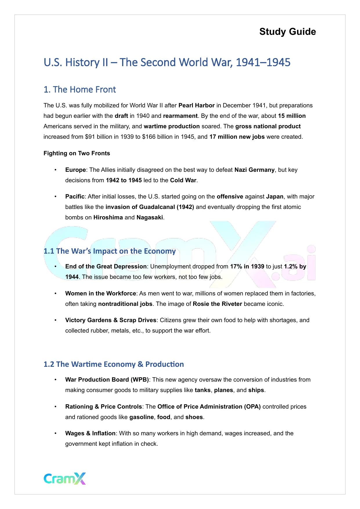 This document provides study materials related to U.S. History II - The Second World War, 1941–1945. It may include explanations, summarized notes, examples, or practice questions designed to help students understand key concepts and review important topics covered in their coursework.