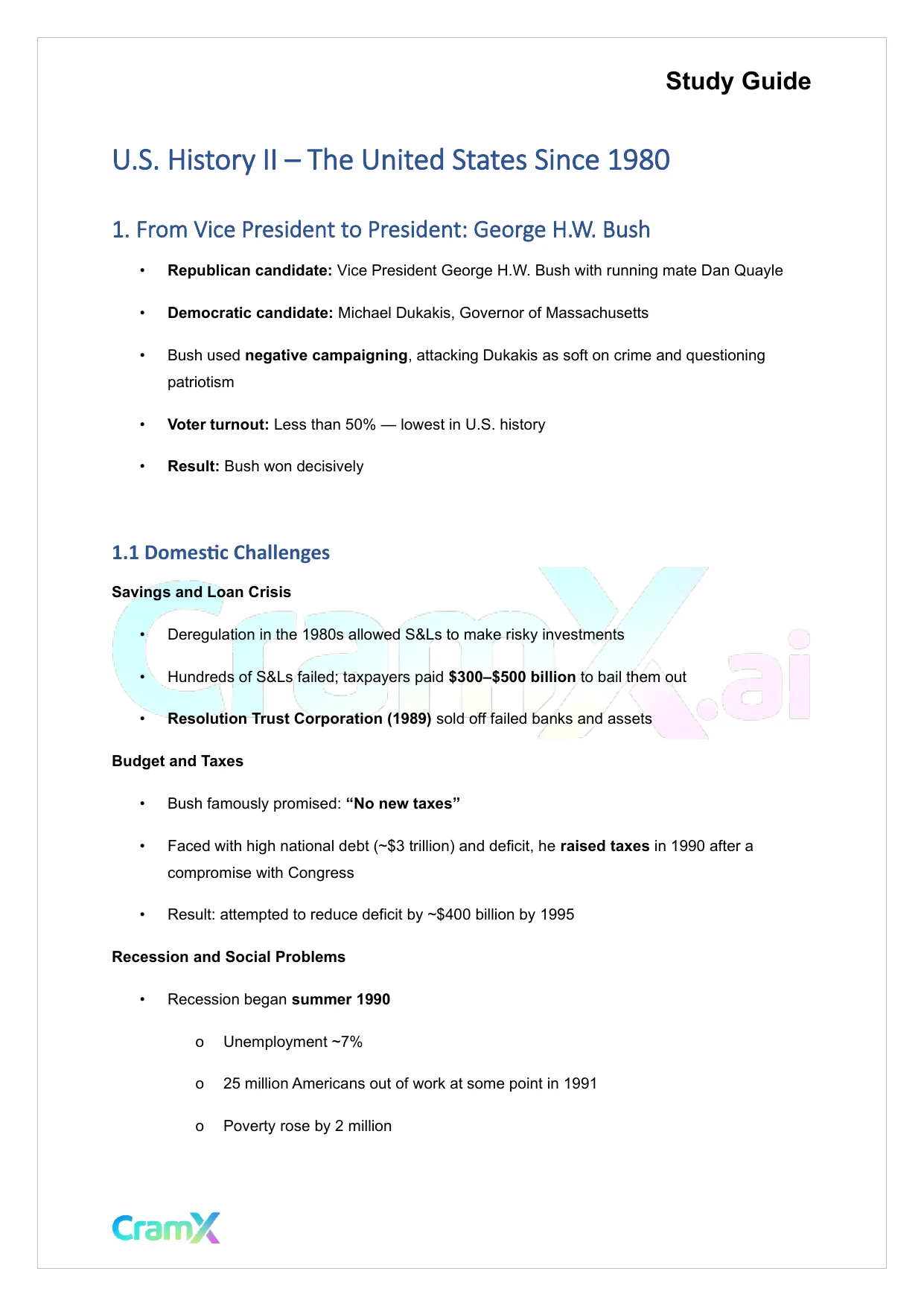 This document provides study materials related to U.S. History II - The United States Since 1980. It may include explanations, summarized notes, examples, or practice questions designed to help students understand key concepts and review important topics covered in their coursework.