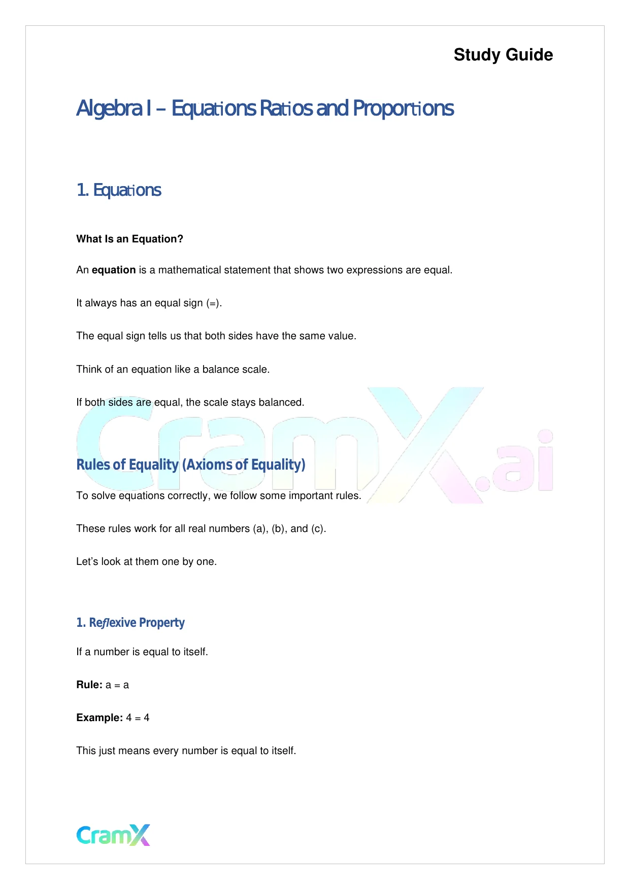 This document provides study materials related to Algebra I – Equations Ratios and Proportions. It may include explanations, summarized notes, examples, or practice questions designed to help students understand key concepts and review important topics covered in their coursework.