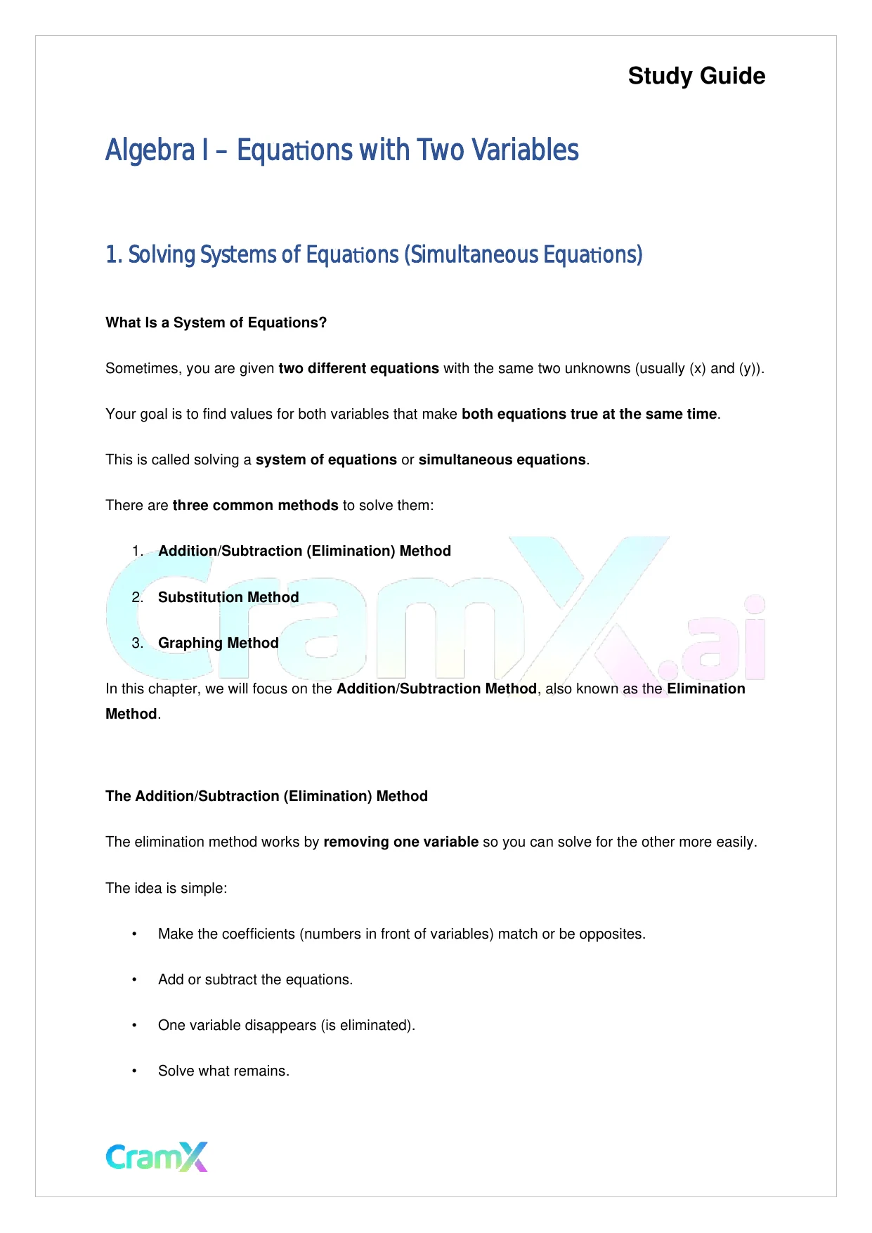 This document provides study materials related to Algebra I – Equations with Two Variables. It may include explanations, summarized notes, examples, or practice questions designed to help students understand key concepts and review important topics covered in their coursework.