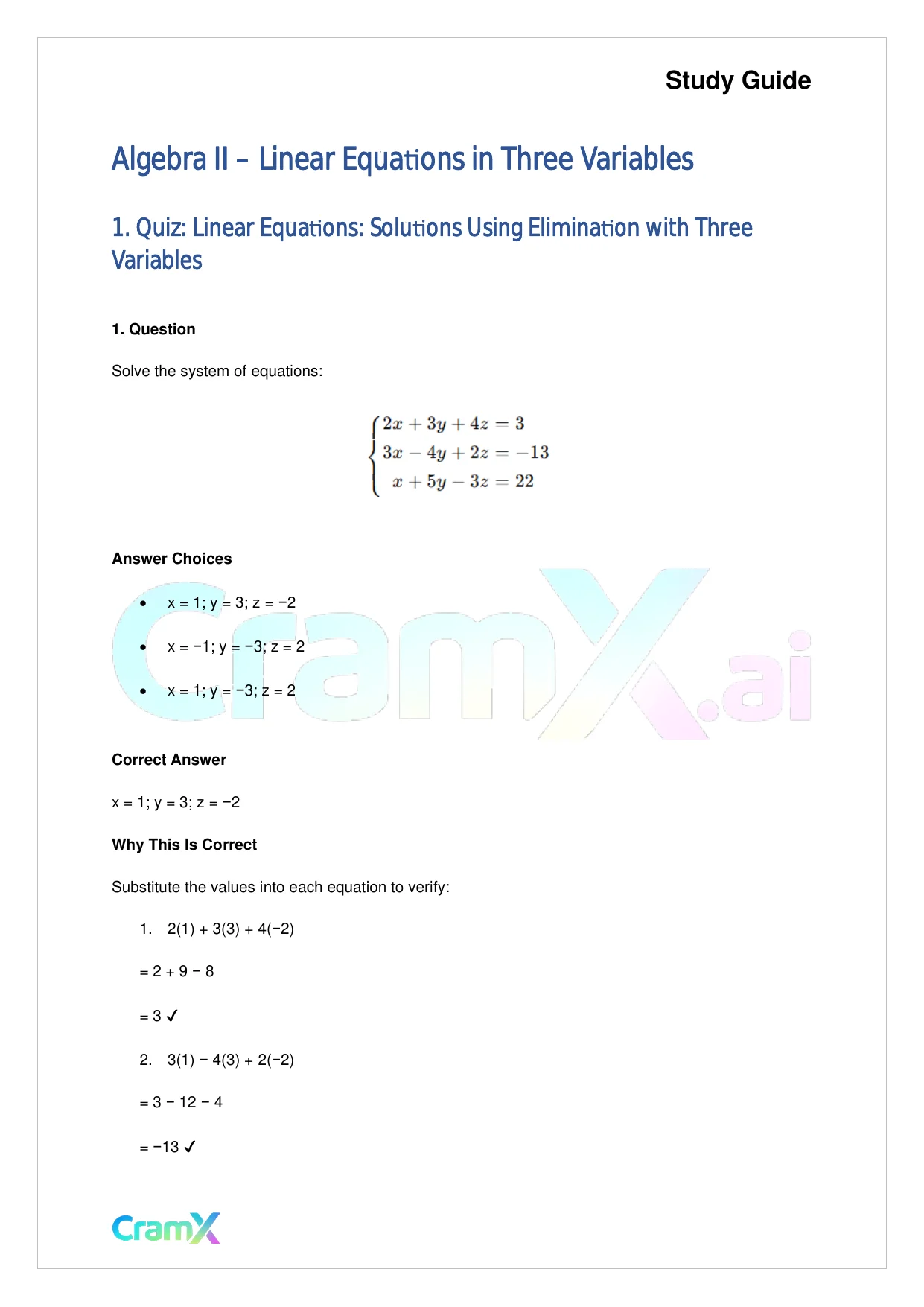 This document provides study materials related to Algebra II - Linear Equations in Three Variables. It may include explanations, summarized notes, examples, or practice questions designed to help students understand key concepts and review important topics covered in their coursework.