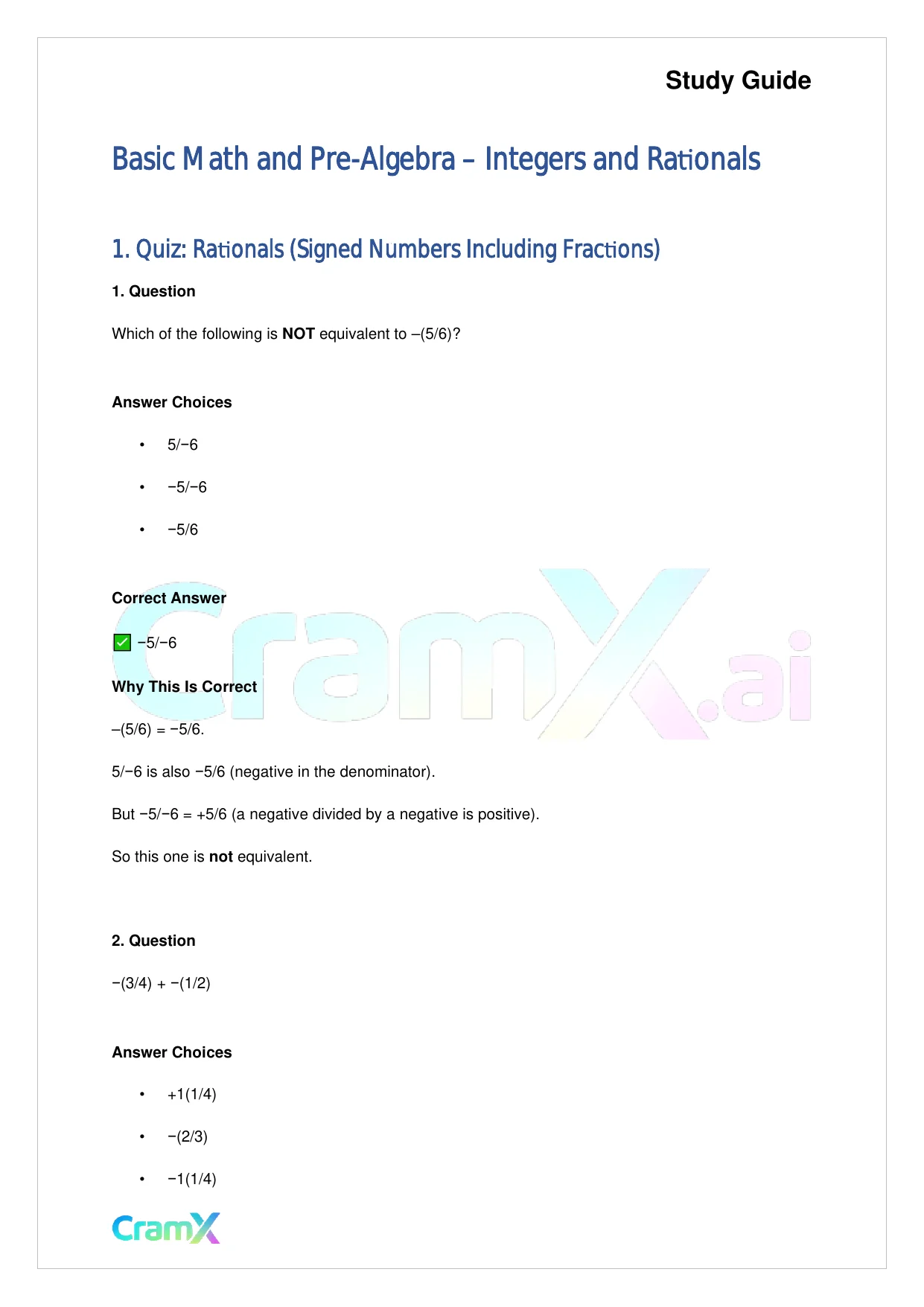 This document provides study materials related to Basic Math and Pre-Algebra - Integers and Rationals. It may include explanations, summarized notes, examples, or practice questions designed to help students understand key concepts and review important topics covered in their coursework.