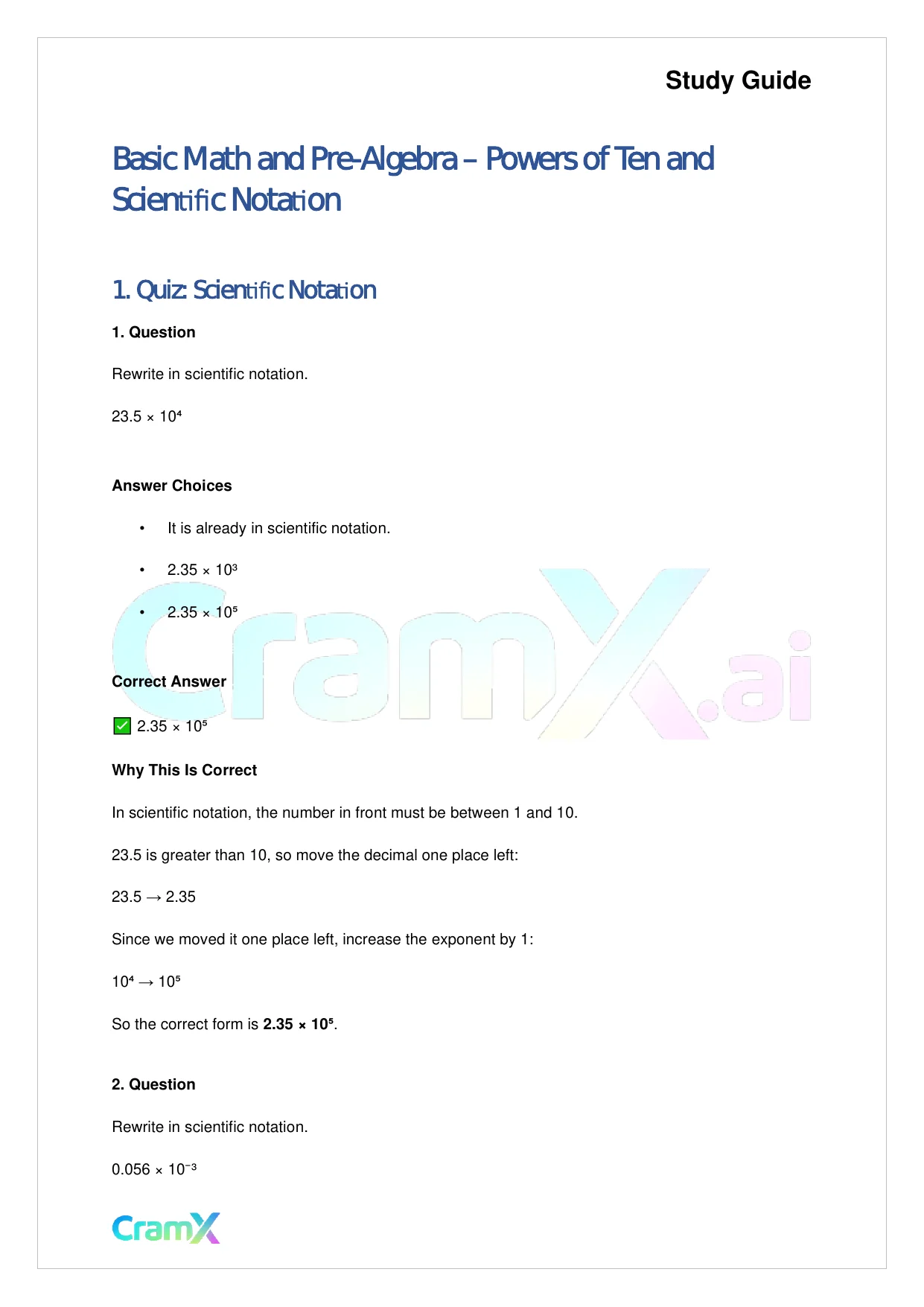 This document provides study materials related to Basic Math and Pre-Algebra - Powers of Ten and Scientific Notation. It may include explanations, summarized notes, examples, or practice questions designed to help students understand key concepts and review important topics covered in their coursework.