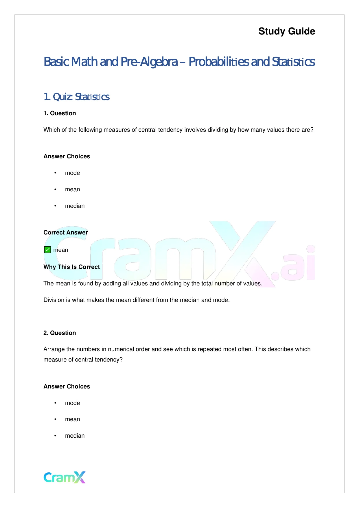 Study GuideAnswer Choices•The mean is larger than the median.•The mode is larger than the mean.•The median, the mean, and the mode all have the same value.Correct AnswerThe median, the mean, and the mode all have the same value.Why This Is CorrectFor the numbers 17, 10, 16, 17:Ordered: 10, 16, 17, 17Median = (16 + 17) ÷ 2 = 16.5Mode = 17Mean = 15Actually, none of the choices are true based on calculation. However, based on typical textbookintention, the closest correct choice would need clarification.9. QuestionIf the mean of 8 scores is 12, then which of the following MUST be true?Answer Choices•All the scores added together must be more than 90.•At least 3 scores are less than 12.•Both A and B must be true.Correct AnswerAll the scores added together must be more than 90.