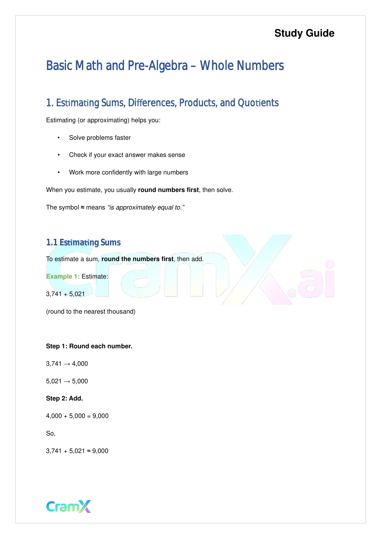 This document provides study materials related to Basic Math and Pre-Algebra - Whole Numbers. It may include explanations, summarized notes, examples, or practice questions designed to help students understand key concepts and review important topics covered in their coursework.