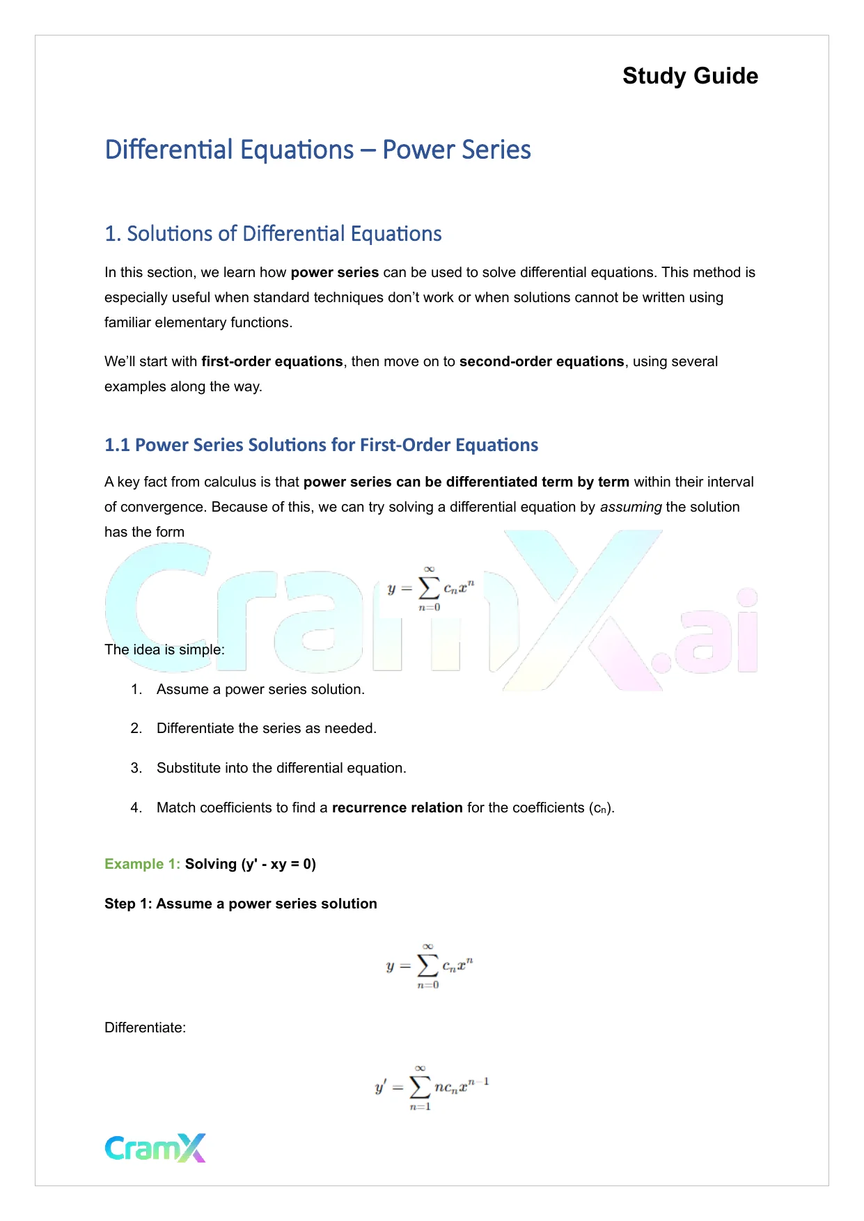 Study GuideDifferential Equations–Power Series1. Solutions of Differential EquationsIn this section, we learn howpower seriescan be used to solve differential equations. This method isespecially useful when standard techniques don’t work or when solutions cannot be written usingfamiliar elementary functions.We’ll start withfirst-order equations, then move on tosecond-order equations, using severalexamples along the way.1.1Power Series Solutions for First-Order EquationsA key fact from calculus is thatpower series can be differentiated term by termwithin their intervalof convergence. Because of this, we can try solving a differential equation byassumingthe solutionhas the formThe idea is simple:1.Assume a power series solution.2.Differentiate the series as needed.3.Substitute into the differential equation.4.Match coefficients to find arecurrence relationfor the coefficients(cn).Example 1:Solving(y'-xy = 0)Step 1: Assume a power series solutionDifferentiate:Preview Mode