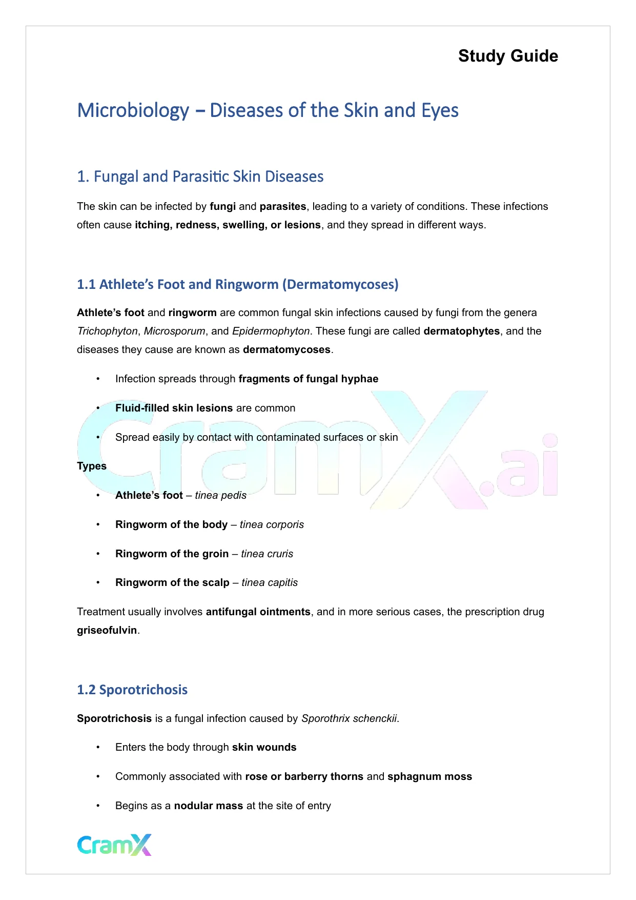 This document provides study materials related to Microbiology - Diseases of the Skin and Eyes. It may include explanations, summarized notes, examples, or practice questions designed to help students understand key concepts and review important topics covered in their coursework.