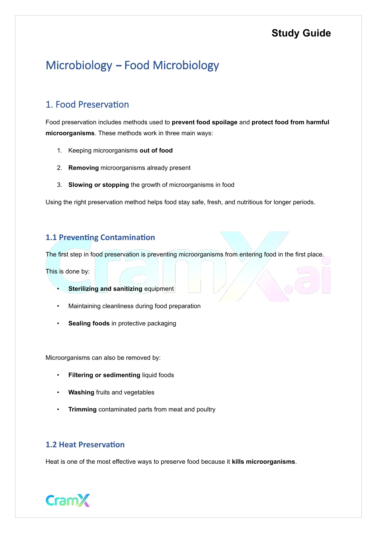This document provides study materials related to Microbiology - Food Microbiology. It may include explanations, summarized notes, examples, or practice questions designed to help students understand key concepts and review important topics covered in their coursework.