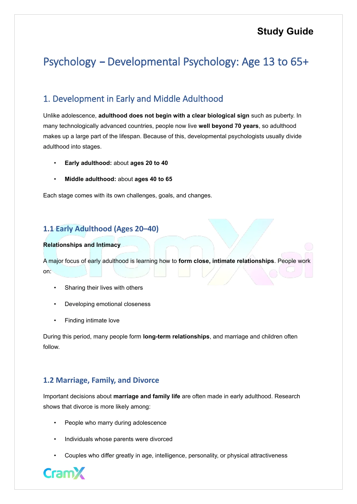 This document provides study materials related to Psychology - Developmental Psychology Age 13 to 65+. It may include explanations, summarized notes, examples, or practice questions designed to help students understand key concepts and review important topics covered in their coursework.