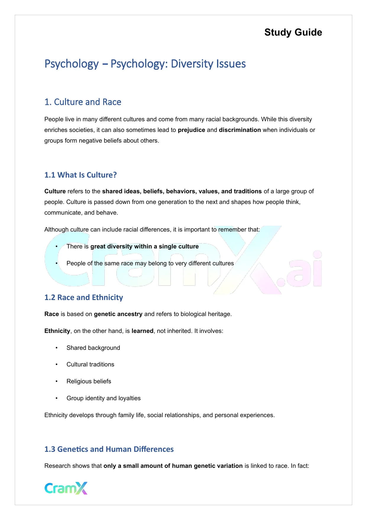 This document provides study materials related to Psychology - Psychology Diversity Issues. It may include explanations, summarized notes, examples, or practice questions designed to help students understand key concepts and review important topics covered in their coursework.