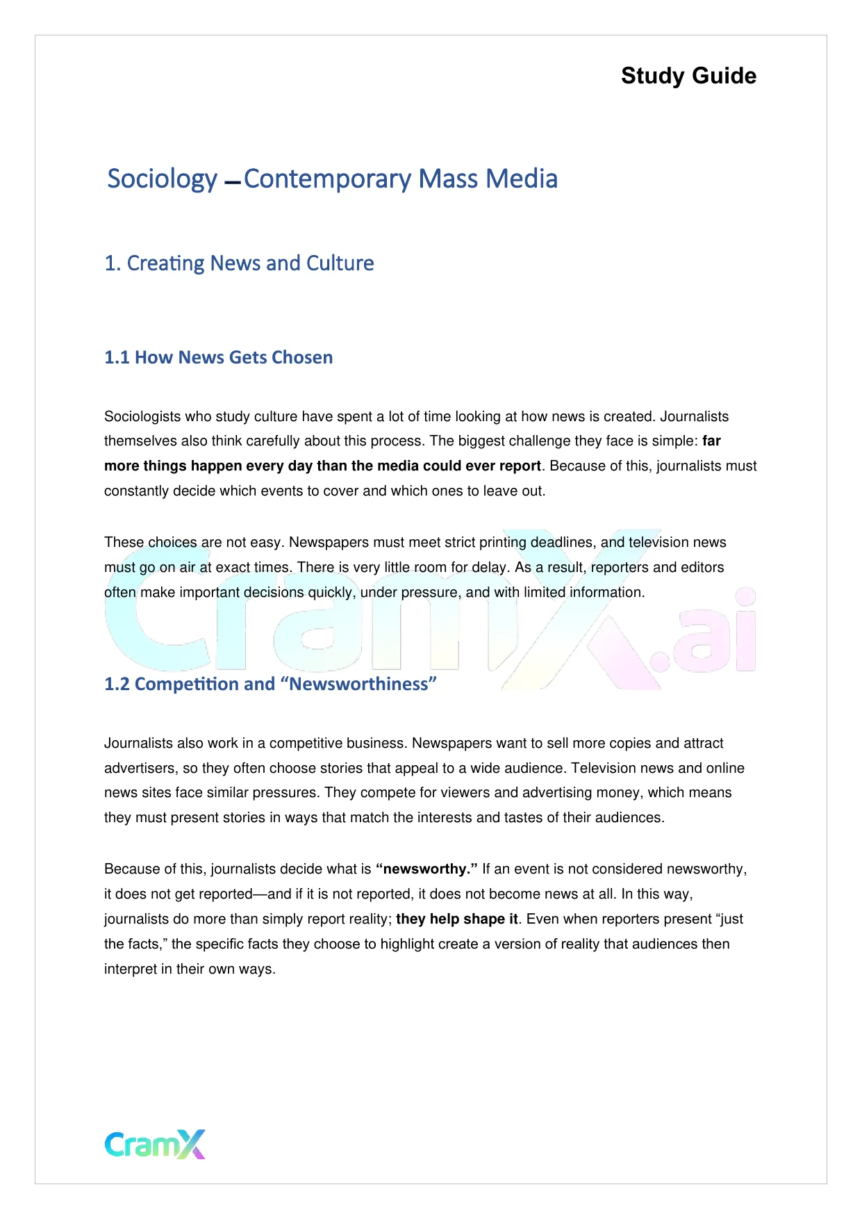 This document provides study materials related to Sociology - Contemporary Mass Media. It may include explanations, summarized notes, examples, or practice questions designed to help students understand key concepts and review important topics covered in their coursework.