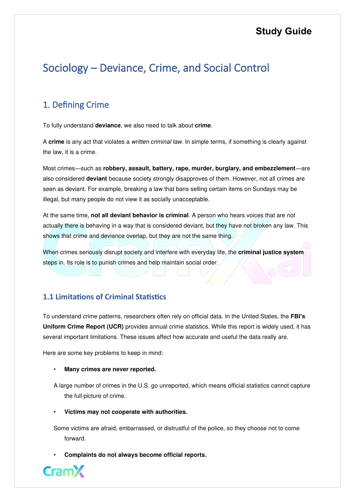 This document provides study materials related to Sociology - Deviance, Crime, and Social Control. It may include explanations, summarized notes, examples, or practice questions designed to help students understand key concepts and review important topics covered in their coursework.