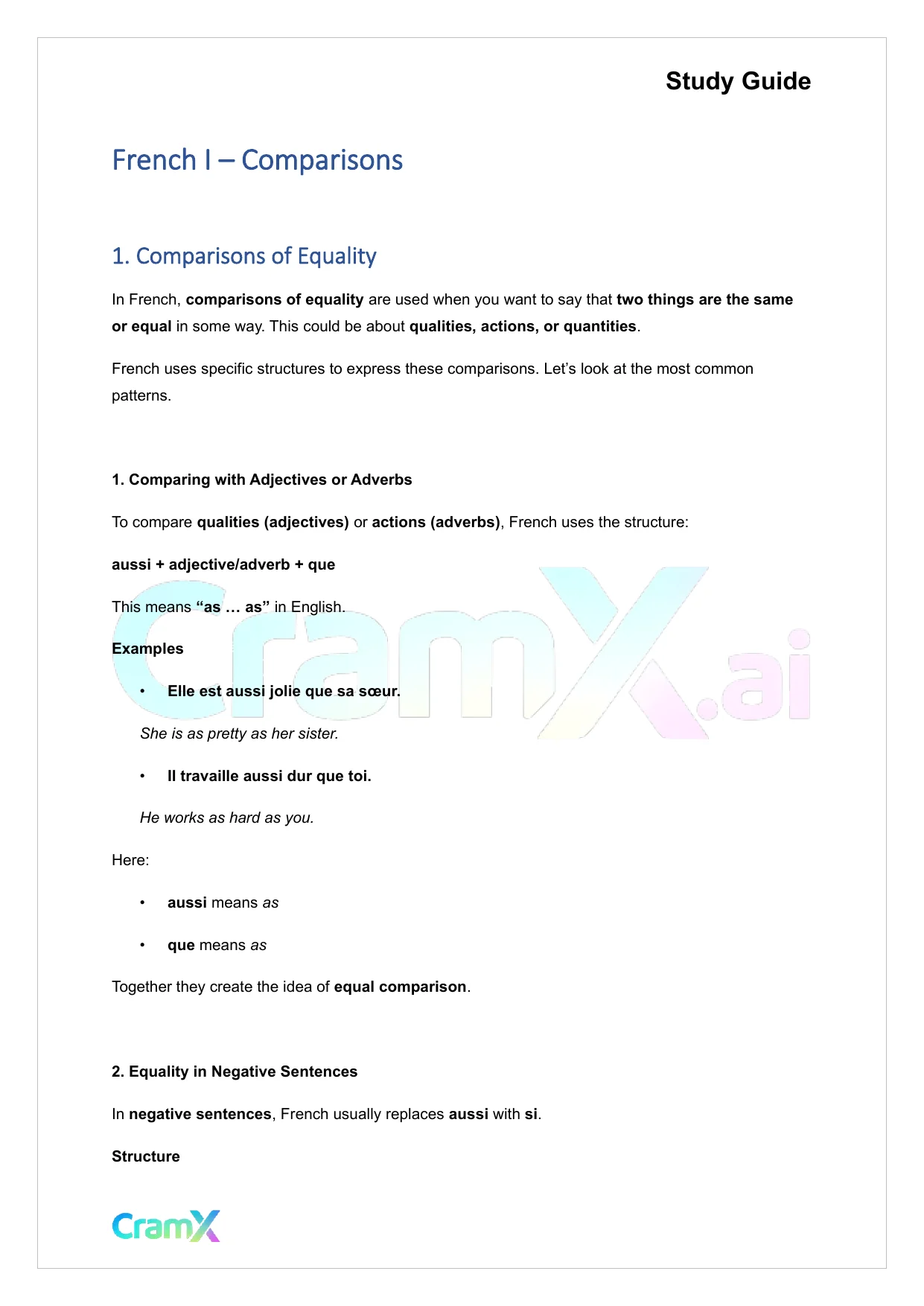 This document provides study materials related to French I - Comparisons. It may include explanations, summarized notes, examples, or practice questions designed to help students understand key concepts and review important topics covered in their coursework.
