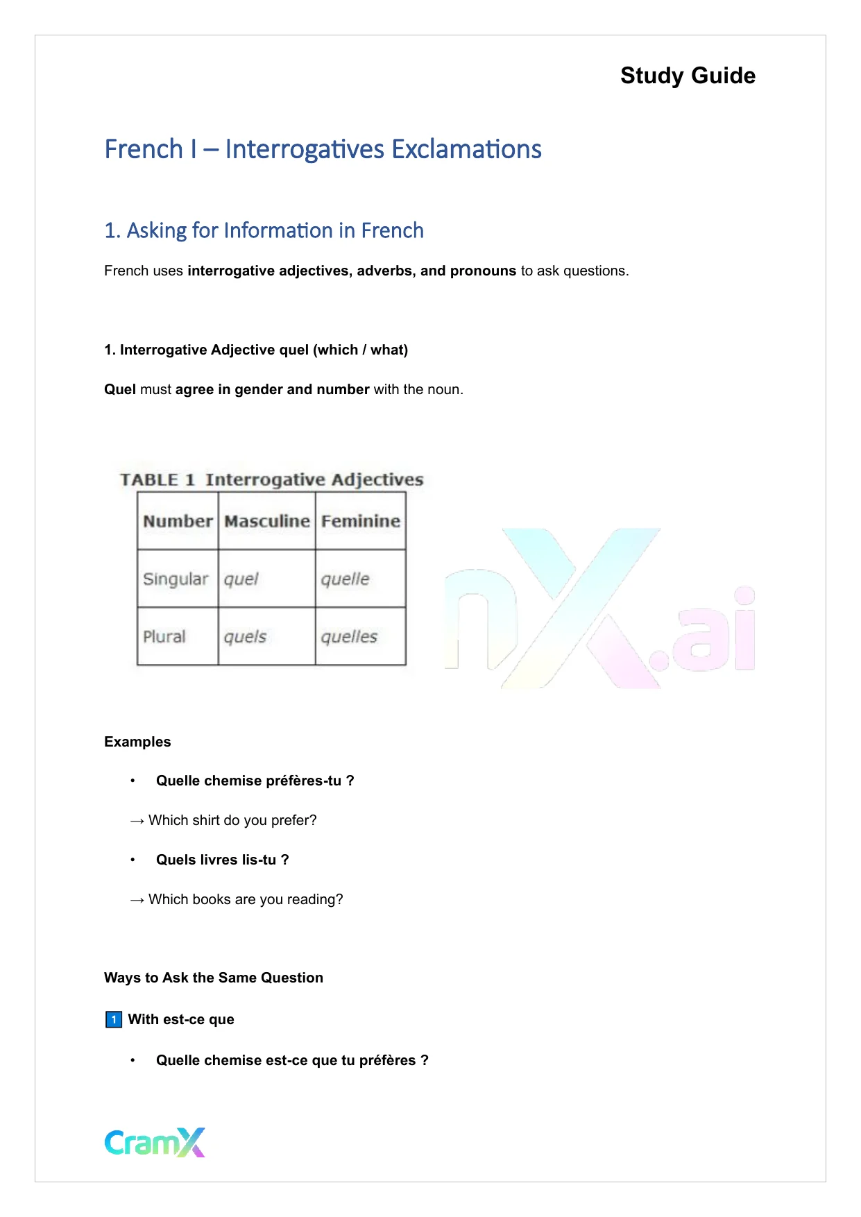 This document provides study materials related to French I - Interrogatives Exclamations. It may include explanations, summarized notes, examples, or practice questions designed to help students understand key concepts and review important topics covered in their coursework.