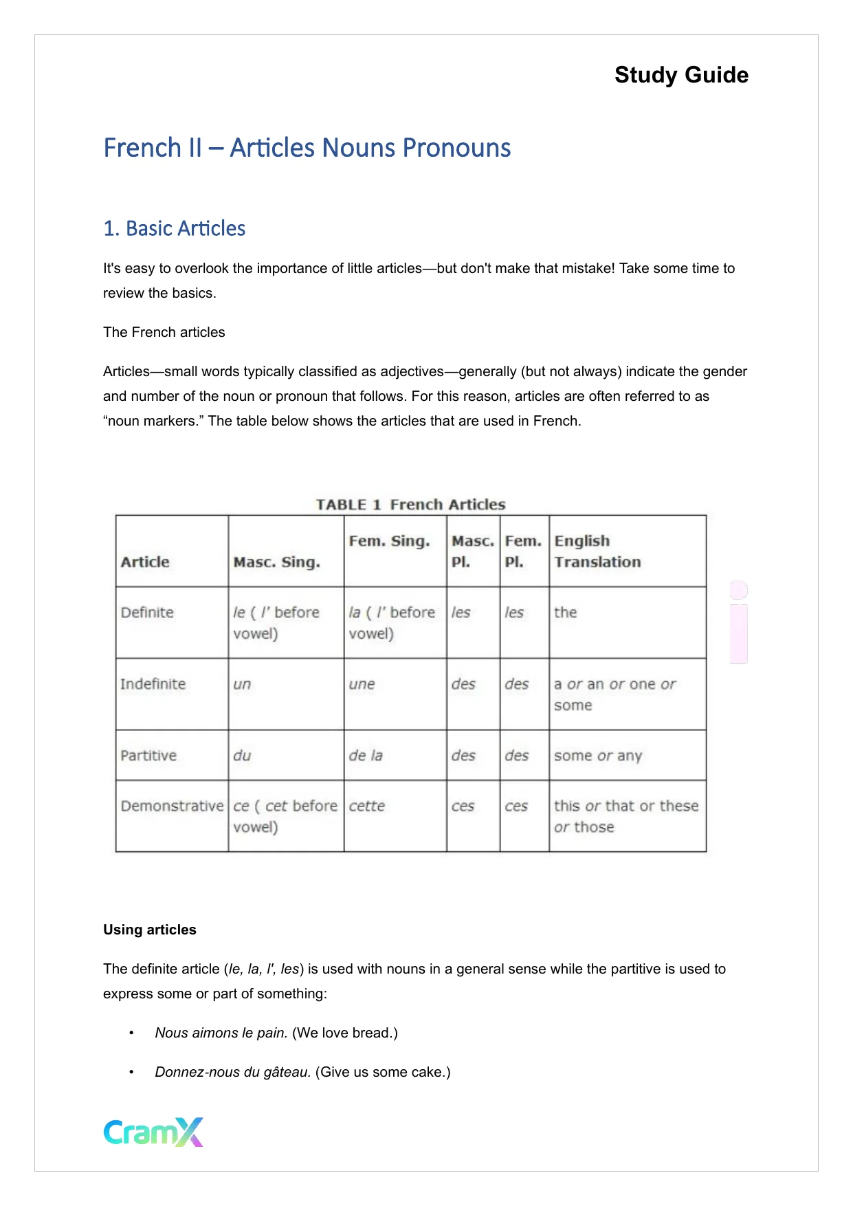 This document provides study materials related to French II – Articles Nouns Pronouns. It may include explanations, summarized notes, examples, or practice questions designed to help students understand key concepts and review important topics covered in their coursework.