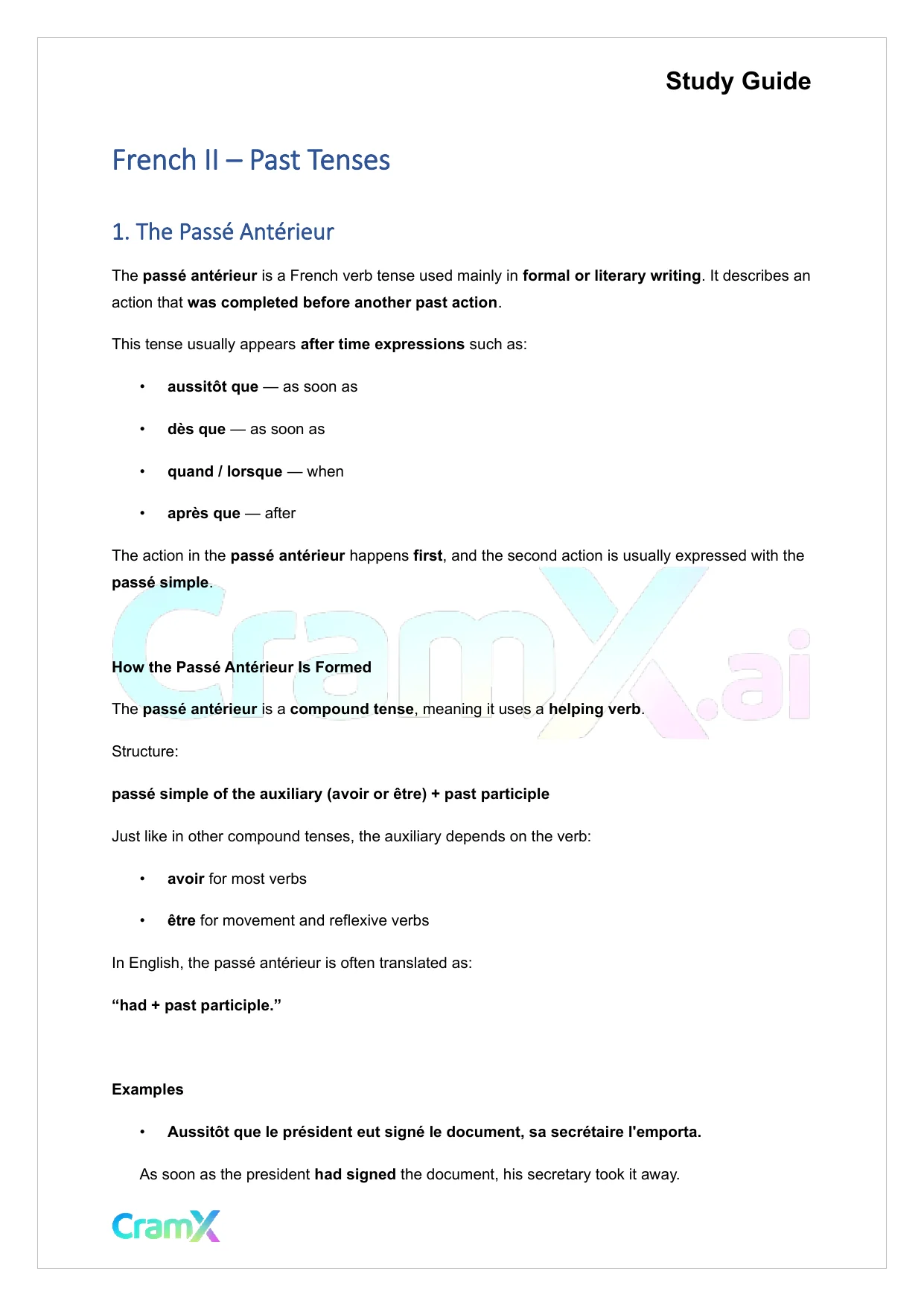 This document provides study materials related to French II – Past Tenses. It may include explanations, summarized notes, examples, or practice questions designed to help students understand key concepts and review important topics covered in their coursework.