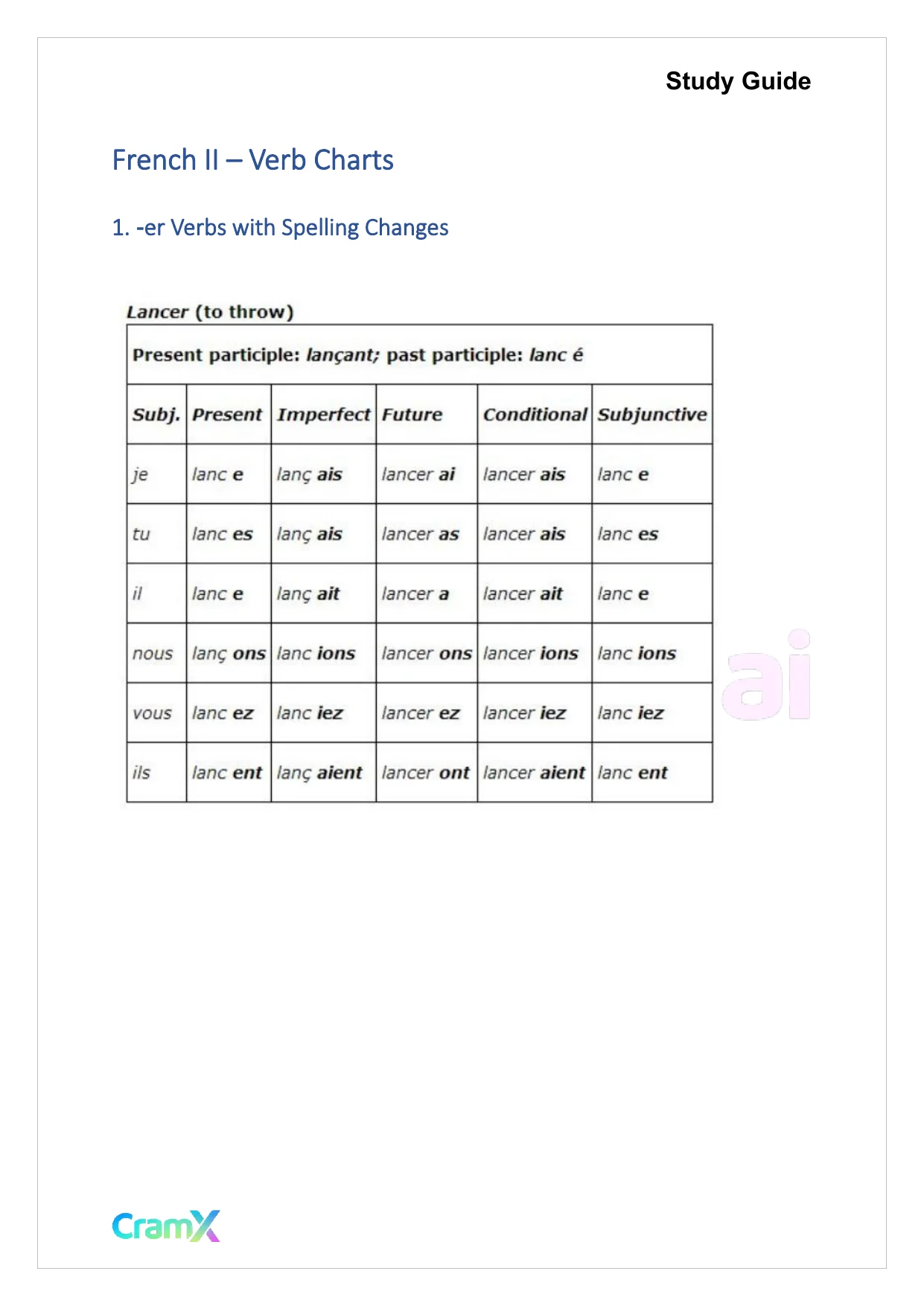 This document provides study materials related to French II – Verb Charts. It may include explanations, summarized notes, examples, or practice questions designed to help students understand key concepts and review important topics covered in their coursework.