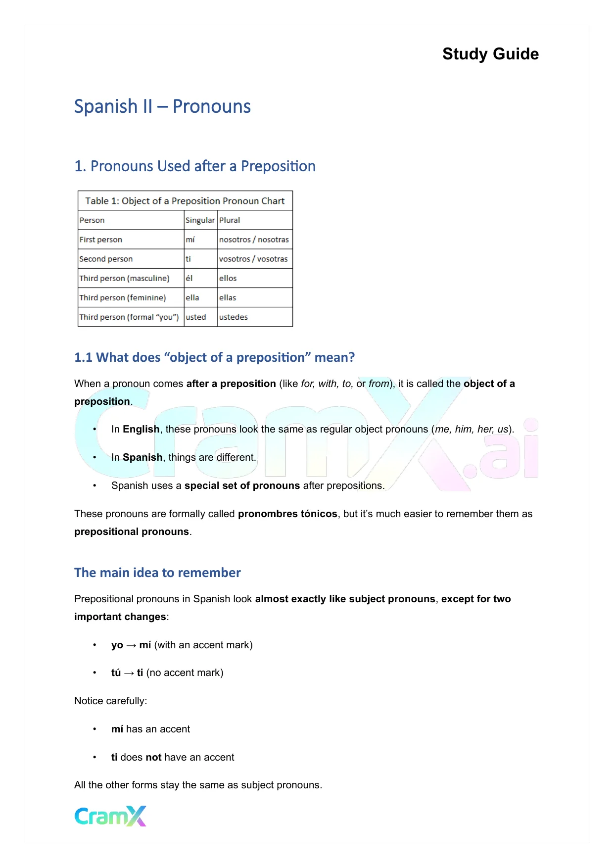 This document provides study materials related to Spanish II - Pronouns. It may include explanations, summarized notes, examples, or practice questions designed to help students understand key concepts and review important topics covered in their coursework.