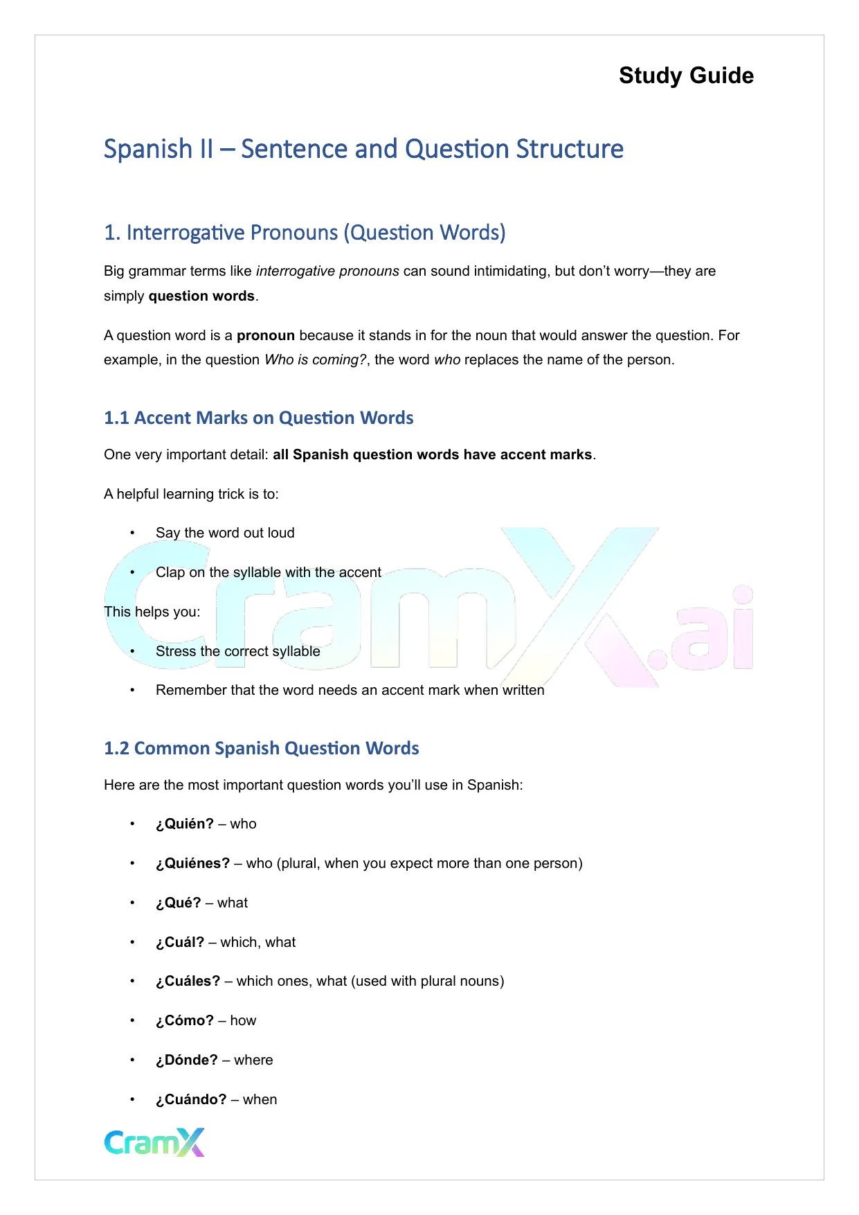 This document provides study materials related to Spanish II - Sentence and Question Structure. It may include explanations, summarized notes, examples, or practice questions designed to help students understand key concepts and review important topics covered in their coursework.