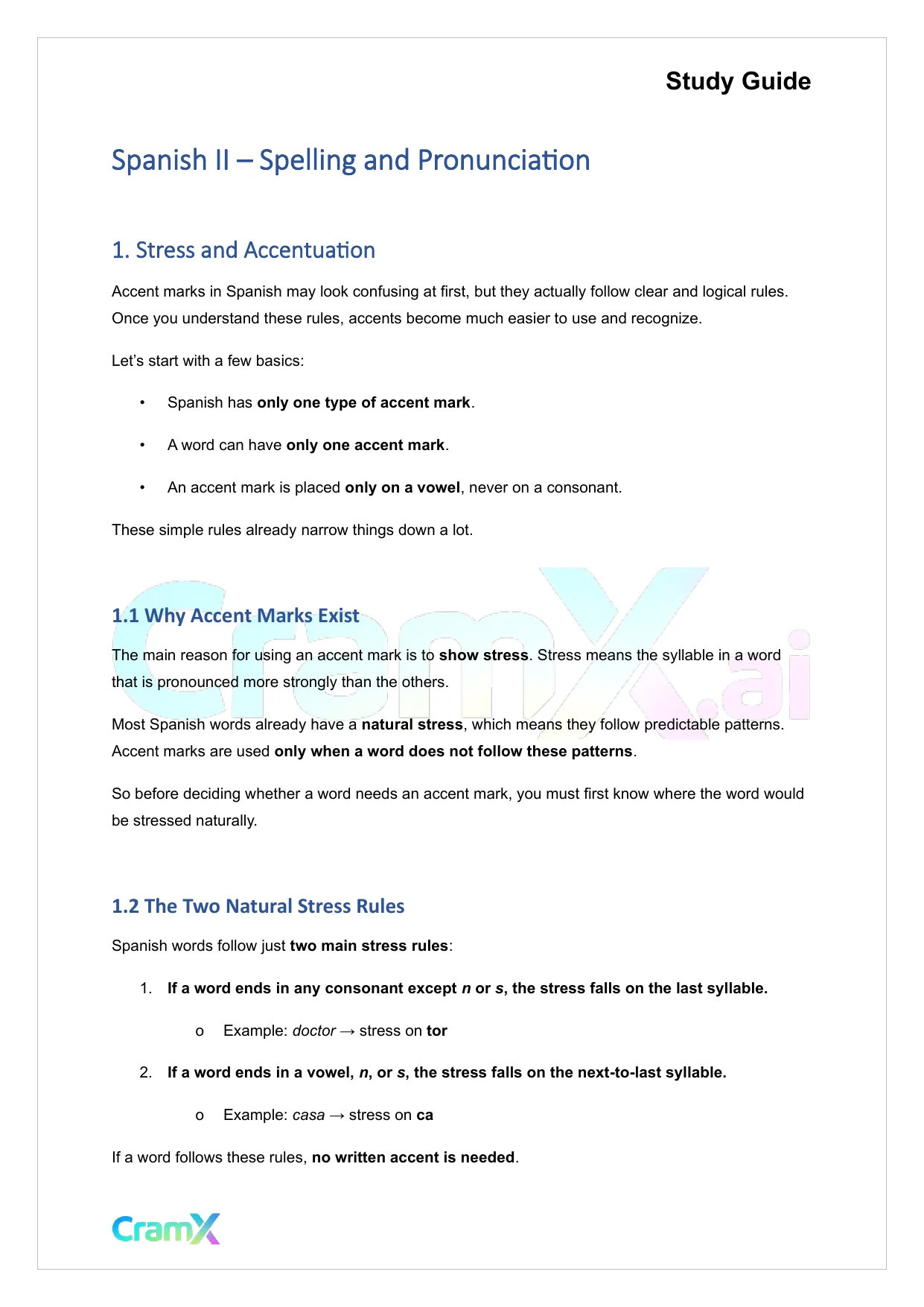 This document provides study materials related to Spanish II - Spelling and Pronunciation. It may include explanations, summarized notes, examples, or practice questions designed to help students understand key concepts and review important topics covered in their coursework.