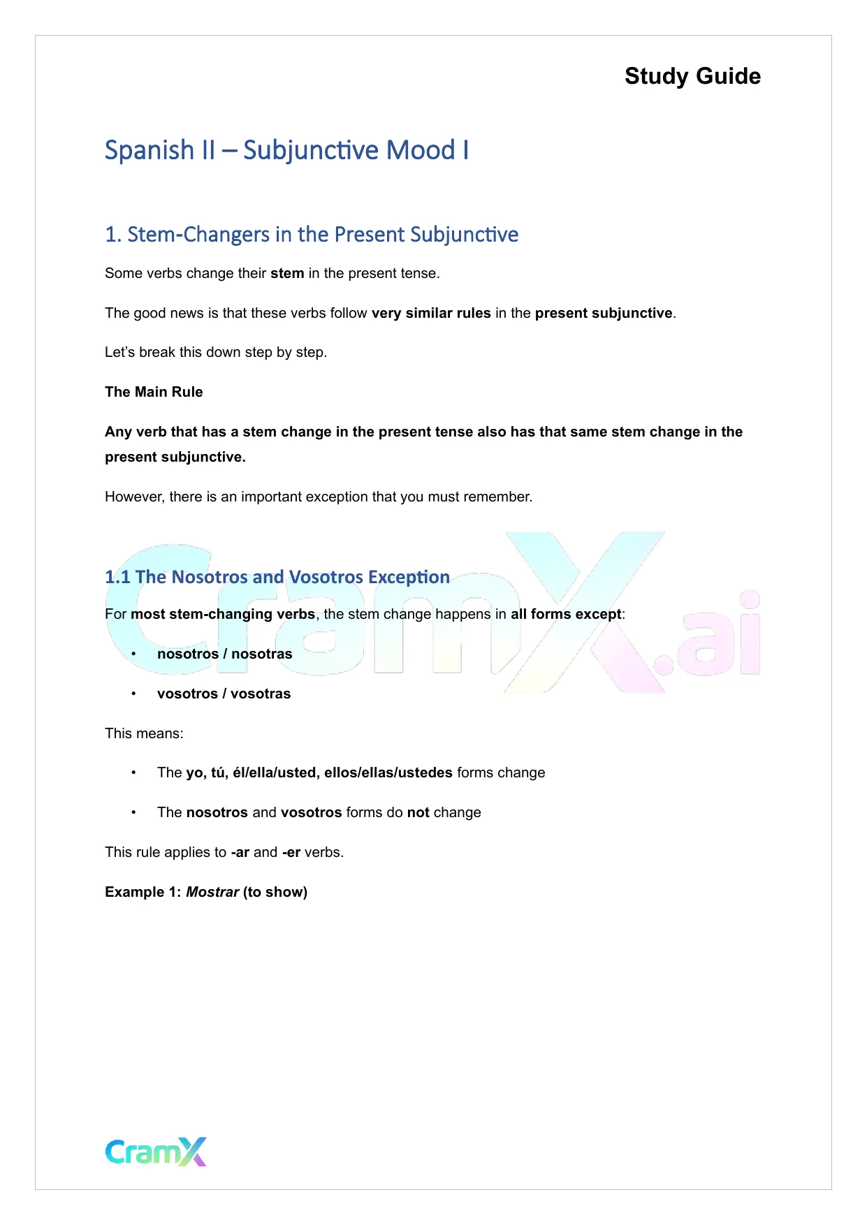 This document provides study materials related to Spanish II - Subjunctive Mood I. It may include explanations, summarized notes, examples, or practice questions designed to help students understand key concepts and review important topics covered in their coursework.